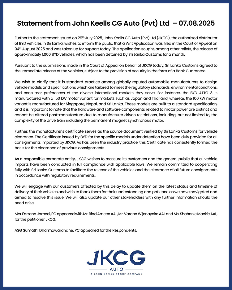 John Keells CG Auto (Pvt) Ltd (JKCG), the authorised distributor of BYD vehicles in Sri Lanka, has announced that the Court of Appeal has ordered the release of approximately 1,000 BYD vehicles that were held by Sri Lanka Customs for nearly a month. The release follows a Writ Application filed by JKCG on August 4, 2025, with the court directing the release upon the provision of a bank guarantee.