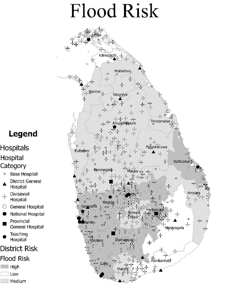 A considerable number of hospitals and divisional medical centres of Sri Lanka operate in flood-prone and landslide-risk areas throughout the country. Figure 1 shows that the analysis of health facilities against national hazard information reveals the location of hospitals by type that exist in districts that currently face the most severe Ditwah impacts in the central highlands and Sabaragamuwa, Gampaha, and Colombo’s surrounding low-lying urban areas. When rivers overflow, health facilities themselves become vulnerable, not just lifelines.